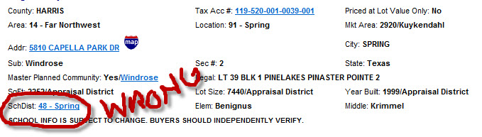This listing is one of several examples of listings in our MLS with errors. The listing states the home for sale is located in the Spring school district. WRONG!! Homes in the Windrose subdivision are located in the Klein school district .