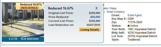 Recently the HAR.com real estate website made modifications to their listing price reduction feature. The modification allows buyers to search for homes with any price reduction instead of just homes that have been reduced in price by 5% or more. Now, any listing that has been reduced in price will have a reduced tag and will show the percentage of the reduction. With a click of the “VIEW DETAILS” button, you will be able to see the original list price, the amount the home has been reduced, and the date of the last reduction. Below is an example: